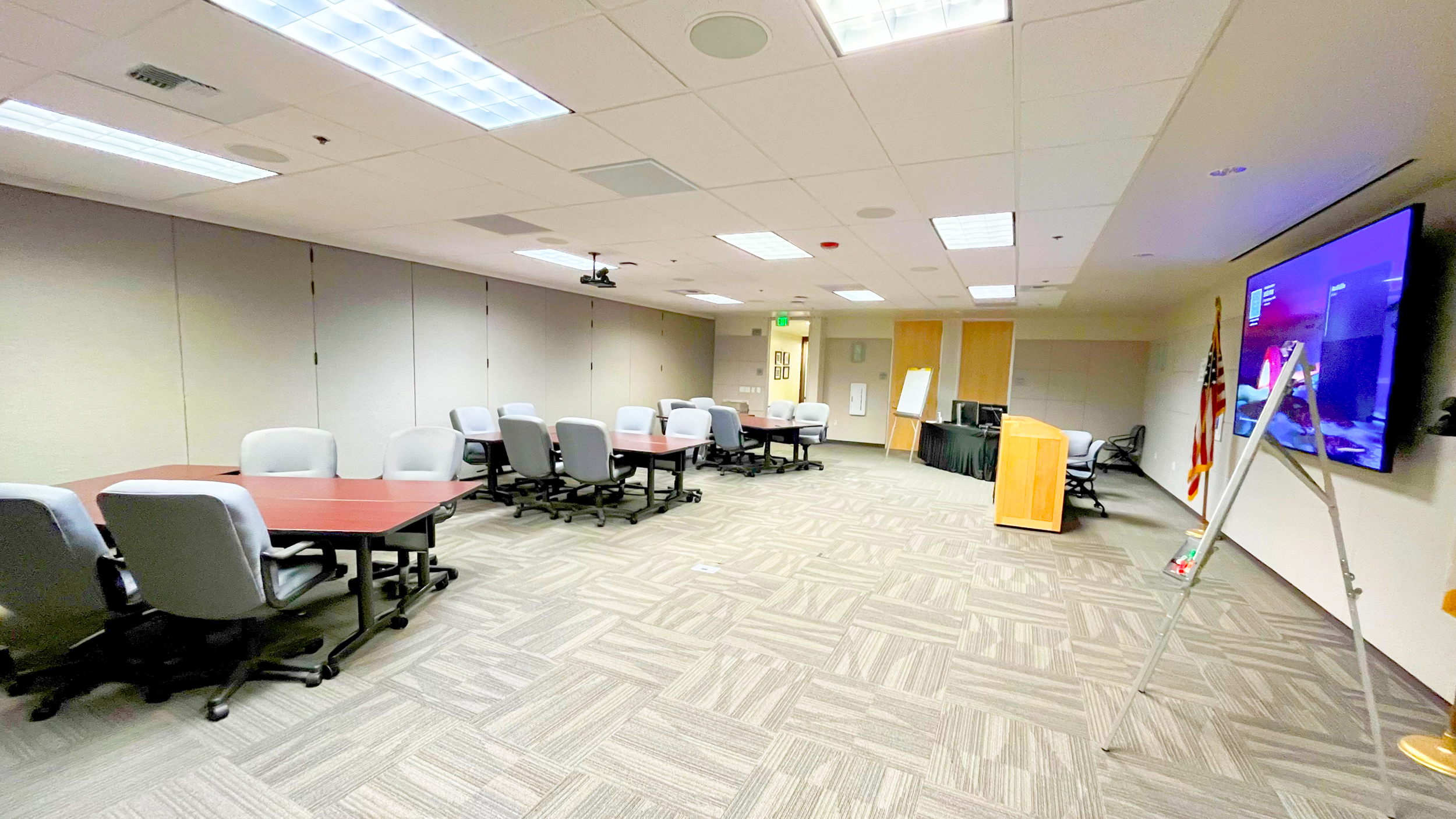 A smaller room seating a maximum of 30. This room comes equipped with ceiling and wireless microphones, a large-format display, flexible connectivity options for presenters, and a full-room speaker system to support clear audio for audiences.